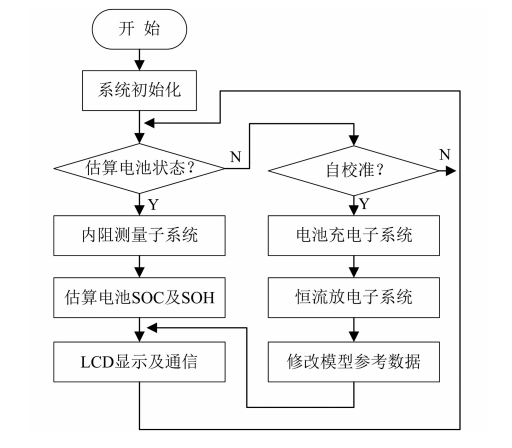 便携式蓄电池SOH及SOC智能检测系统的主程序是一个不停循环的结构,周而复始地根据用户指令对蓄电池进行检测与控制,软件实现主流程如图4所示。系统主要有两大功能,即估算电池状态和自校准,其工作原理及过程如下: